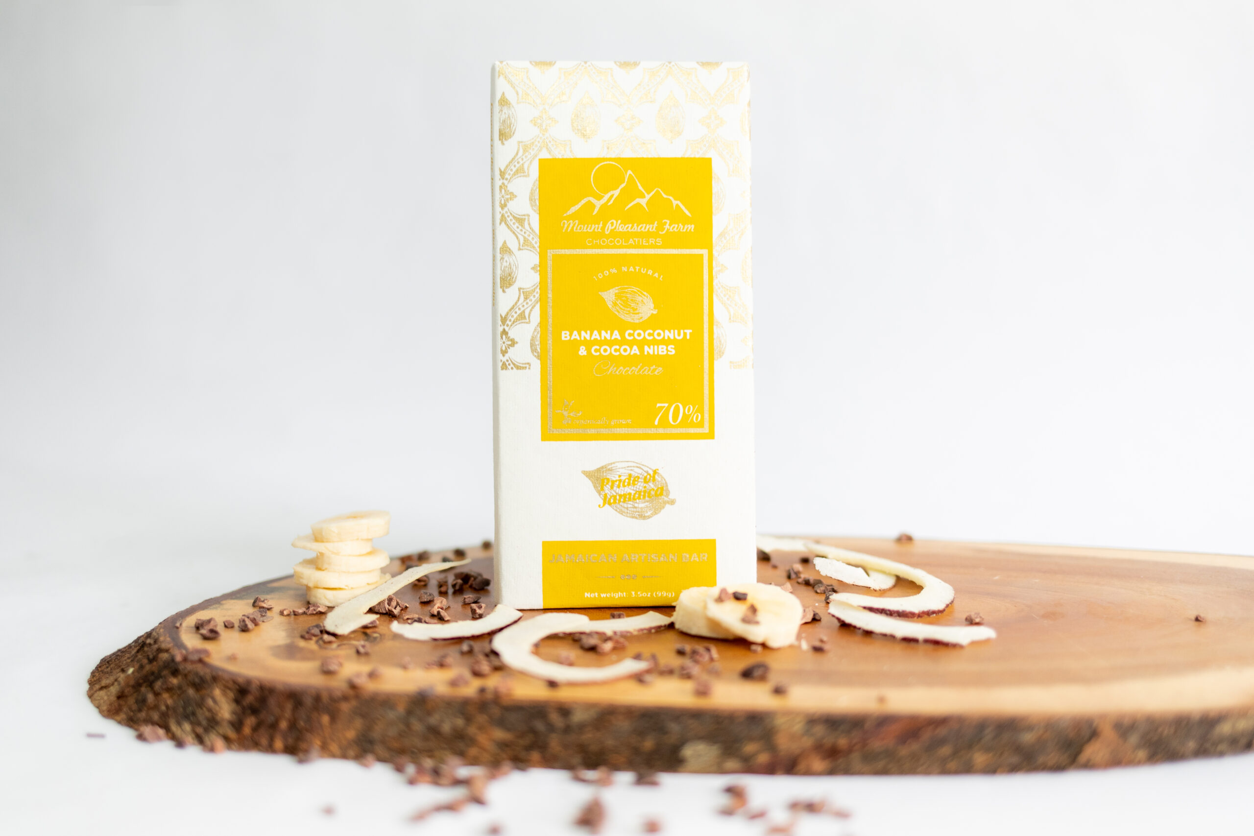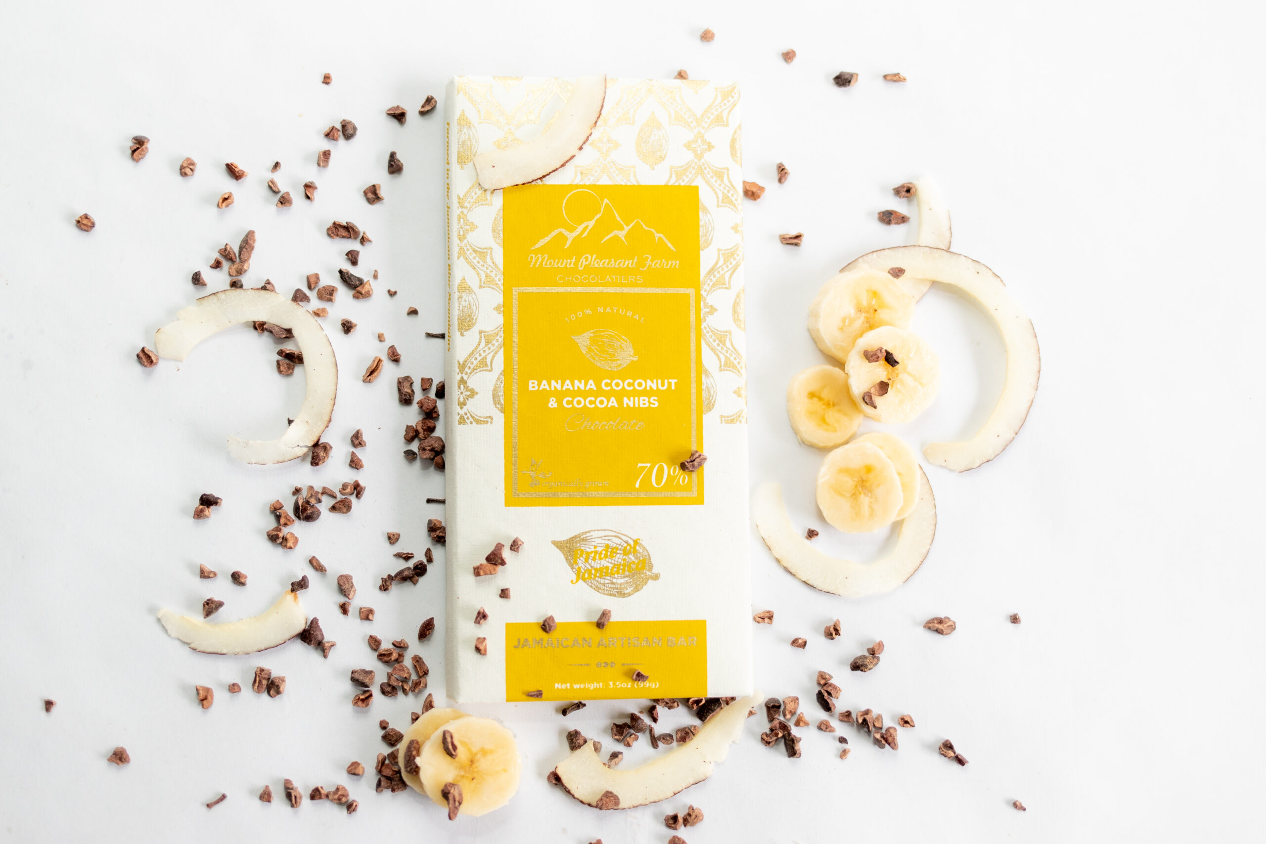 We have put together coconut bar using freshly hand roasted Jamaican coconut from our farm, banana, and cocoa nibs. the coconut, banana and nibs grated in small flex and beautifully combined with freshly made chocolate to deliver a tropical coconut taste and a fulfilling energy boost we like to call this bar a smooth in bar form. It’s complemented well with our naturally sweet smooth fruity 70% dark chocolate.